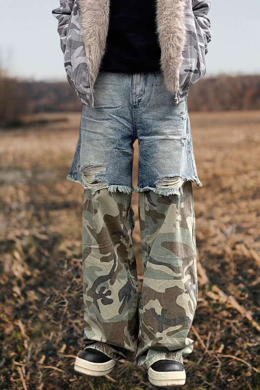 Patchwork Camouflage Washed Ripped Baggy Jeans