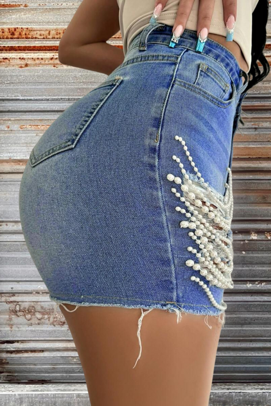 Pearl Chain Cut-Out Ripped Denim Shorts