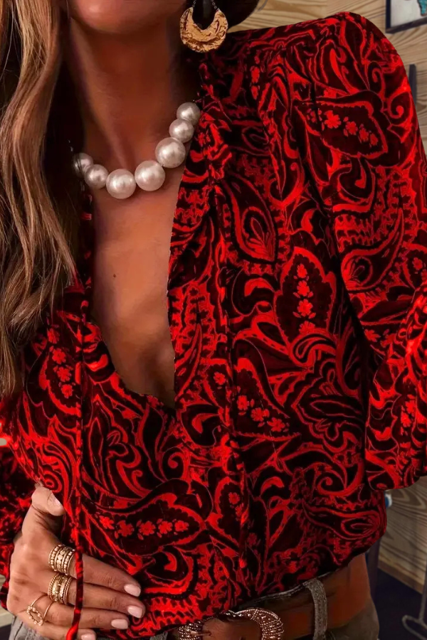Step into timeless sophistication with this olive-toned paisley blouse. Featuring a deep V-neck, billowy sleeves, and intricate paisley prints, it merges retro elegance and boho grace. Pair it with pearls or western belts for a versatile, chic look.