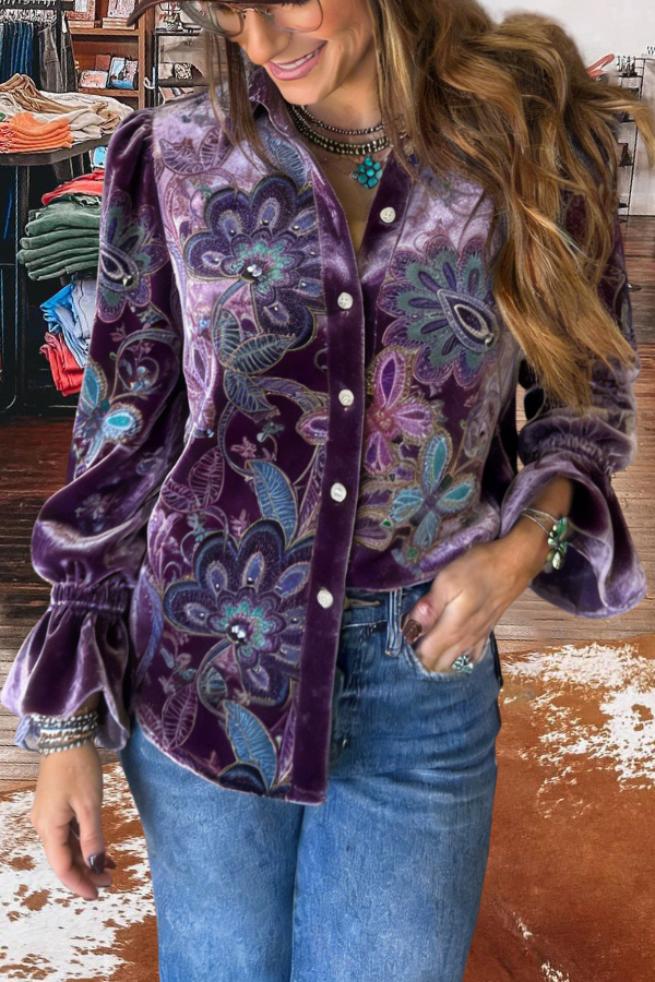 Vintage Floral Print Flared Cuffs Velvet Shirt