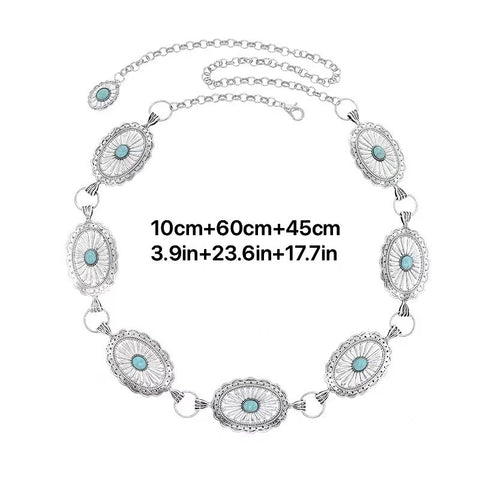 Add a touch of vintage charm with this exquisite silver belt. Featuring intricate silver patterns and stunning turquoise stones, it’s a timeless piece that enhances any outfit with elegance and style.